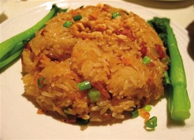待糯米炒至8成熟时,将火调至小火,将香菇、胡萝卜倒入,加入少许盐、蚝油、生抽、白糖、鸡精调成的汁。不停地翻炒,直至糯米完全炒熟。