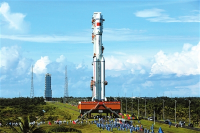 6月22日,长征七号运载火箭在垂直转运过程中。