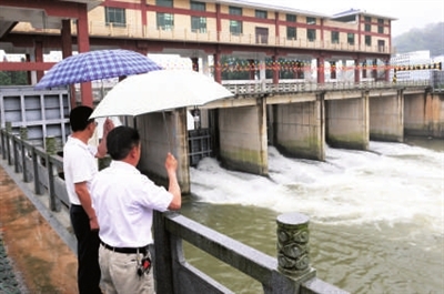 (上图)27日下午3点,咸安区大畈陈拦水闸,值班人员正在观察淦河水下泄流量。近期持续强降雨,该拦水闸安排人员24小时值班,及时监控淦河上游水情和雨情。