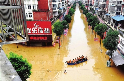 (右图)28日,经历了一晚的连续强降雨,通山县多地受灾,在城区,洪水已经漫过街道,淹没了沿街的店铺。灾情出现后,该县立即组织开展抢险救灾工作,确保群众生命财产安全。 记者 程慧 摄