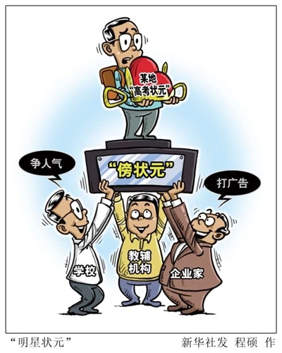 除了给高考“状元”赠送房产,近年来,“敕封”高考“状元”、请“状元”进行商业代言,让“状元”骑马游园为景区造势等炒作类报道也频频见诸报端。