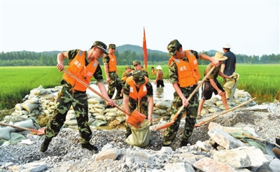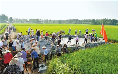 图为消防官兵和群众正在铲运石子、搬泥土、扛沙袋,对管涌进行处置。