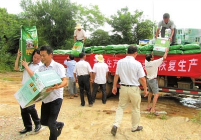 图一:社会各界向灾区捐赠化肥、种子、农药等生产物资。