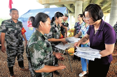 19日,咸安区西湖围堤向阳湖段,省妇联一行将慰问品发到守堤女干部手上。省妇联一行当天还来到西湖围堤官埠桥段和汀泗桥古塘村,走访慰问守堤女干部和受灾女大户,送去近10万元的慰问物资。