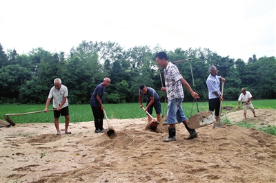 昨日,通城县沙堆镇大柱山村村民恢复水打沙压稻田。