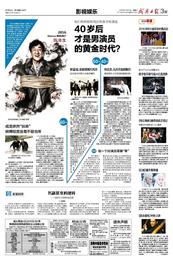 如今大银幕到处都是“小鲜肉”,却始终掩盖不住那些“老炮儿”的风采。正在热映的《绝地逃亡》里,已经62岁的成龙一如既往地上山下海,各种肉搏出击十分拼命。无独有偶,郭富城、梁家辉、钟汉良、古天乐、吴镇宇等中年男演员最近也有不少作品正在上映,虽然早就功成名就,但他们却依然活跃在大银幕上,且依然不惧挑战自我,为观众创造出更多不同类型的新鲜角色。 成龙依然“玩命”拼搏程度丝毫不输当年