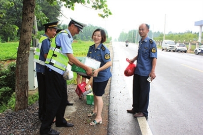 7月27日,咸安区马桥治超检测站工会深入双溪治超点、大幕治超点和流动中队,慰问一线执法人员,并送去毛巾、矿泉水、西瓜等防暑物品。 通讯员 罗琼摄