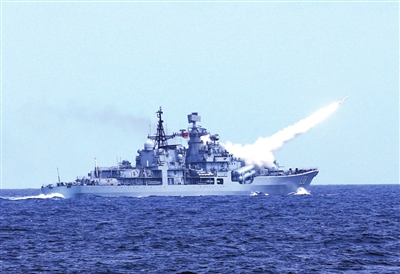 8月1日,在东海举行的实兵实弹对抗演习中,泰州舰发射对空导弹。