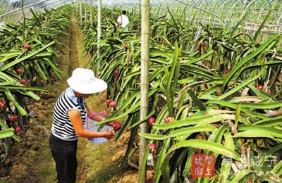 该农场负责人肖林介绍,3年前从南方引种培育,种植面积达10亩,目前红水晶、白龙果等4个品种进入收获期,亩产2500公斤。在他的示范带动下,周边已建成三个火龙果种植基地,成为市民休闲观光采摘基地。