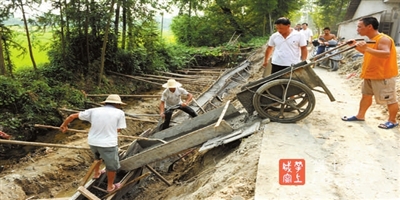 7月17日的特大暴雨将该村一段长约30米的河堤及公路护坡冲毁,给公路及公路另一侧村民房屋带来严重安全隐患。这条公路关系到关刀、隽水、沙堆3个乡镇近4万群众的出行。洪水退后,镇村立即组织人力物力,疏浚河道,筑牢河堤地基,加固公路边坡。