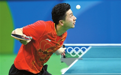 8月12日,马龙在比赛中。当日,在2016年里约奥运会乒乓球男子单打决赛中,中国选手马龙以4比0战胜同胞张继科,获得金牌。