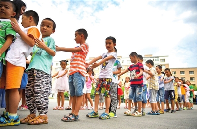 8月23日,长春市树勋小学的一年级新生在操场上练习队列动作及站位。