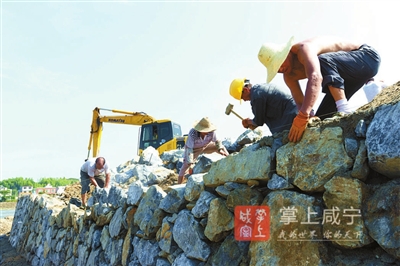 连日来,通城县塘湖镇图垅村村民正冒着酷暑抢修大白河河堤。