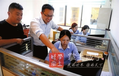 17日,通山县电商创业创新基地内,员工正上线为客户进行农产品交易。去年以来,通山县筹资1500万元建设电商创业创新基地,并成功引进阿里巴巴村淘、京东等30家知名电商企业入驻,今年上半年实现网上交易额达2亿元。 记者 袁灿 摄