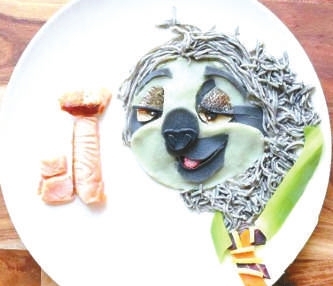 用米饭、鸡肉、全麦饼,做成了功夫熊猫;用灶烧鸡肉、菠菜、紫菜和饭团搭配,做出浣熊师傅;用腌制鸡肉、土豆泥、紫甘蓝、全麦面包组合成小黄人;用黑豆、全麦饼做出米奇……