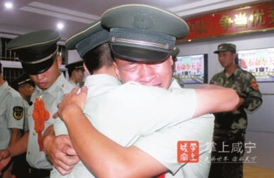 8月31日,武警咸宁支队举行2016年夏秋季老兵退伍仪式,百余名退伍老兵恋恋不舍地摘下领章、帽徽,光荣退伍返乡。 通讯员 何彦卿 摄