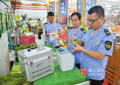 随后,他们又来到镇街道的一超市,对超市蔬菜专柜的莲藕、白菜、辣椒等蔬菜进行现场快检,初步结果为各项指标合格。在用仪器对蔬菜进行快检的过程中,有许多的顾客也凑聚过来,现场目睹执法人员的检查全过程。顾客们说,有了食药监执法人员的辛勤工作,我们购买的东西也可以放心的食用了。