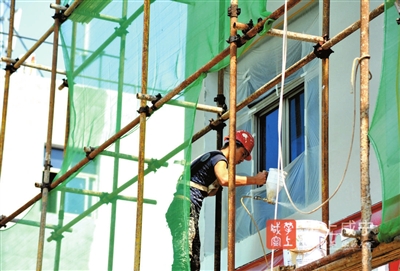 7日,银泉大道,工人们正在给沿街房屋外墙粉刷。据了解,这是市政府启动的银泉大道(含马柏大道)综合整治工程,起于永安大道与银泉大道交叉口,止于南外环交叉口,全长约8.2千米,整治内容包括两边房屋立面整治和人行道改造等。改造后将进一步改善居民的出行环境。