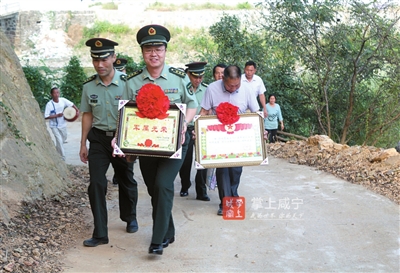 21日,崇阳县金塘镇石店村三组锣鼓阵阵,鞭炮声声,热闹非凡。该县人武部、民政局领导驱车60多公里,来到士官陈昂的家中,把他在部队服役荣立二等功的喜报亲自送上门挂上墙,并送去了慰问金和慰问品。