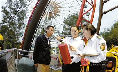 29日,市安监局执法人员在十六潭公园检查消防器材配备情况。国庆佳节即将到来,市安监部门积极开展节前安全隐患大检查活动,重点对全市煤矿、危险化学品、游乐园等领域场所进行检查。 记者 袁灿 摄