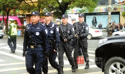 2日,市公安特警小分队在温泉街头巡逻。国庆长假期间,市公安部门组织公安特警在闹市区、街道、车站等人员密集场所,全天候执勤巡逻,保障市民及游客安全。
