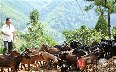 戴志水介绍,他利用深山天然的牧场,进行山羊养殖。从2013年开始放养黄羊、黑山羊。2014年以来,每年出栏肉羊、种羊100多头,销往江西、武汉、长沙等地,年收入达10万元,一家人过上小康生活。