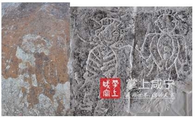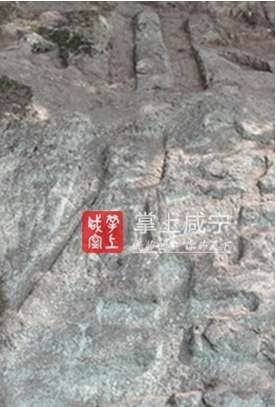 四是图像类。有二处图像,位于隶书石刻“赤”的正下方,为阴刻人物画像,线条清晰。一处石刻为诸葛亮像,分布面积2.25平方米。另一处石刻为两个戴冠执矛士兵像,分布面积为0.72平方米。