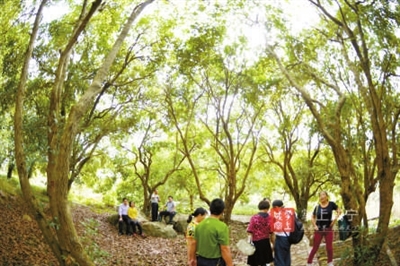 林间寻秋有趣味。十六潭的山林间,几位老师带领一群幼儿园学生,寻找不同颜色和形状的落叶。