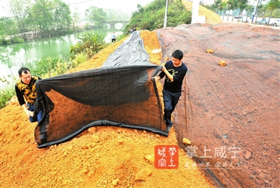 16日,城区西外环,咸安区城投公司干部职工正在对道路两边裸露的黄土进行覆盖。