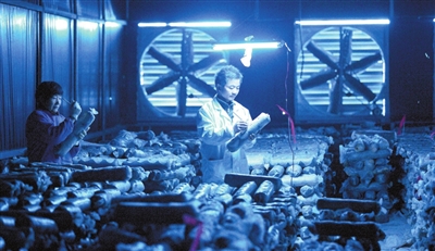 1日,咸安区向阳湖奶牛场湖北珍诚菌业有限公司,技术人员正在对菌棒增氧孔进行检查。