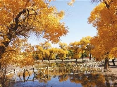 大美无言。片片金黄的胡杨叶阔而不凡,在千百年老树上静静地绽放,静观世间的繁华与悲凉。最美的是环绕胡杨林如柔曼轻纱般的河水,清澈得像婴儿的眼睛,汩汩地流淌着。走在木栈桥上,你不忍心大声喧哗,生怕惊扰了这片胡杨的安宁。缓缓地走,静静地赏,把美景装进相机,像是把爱沉在心海的深处。