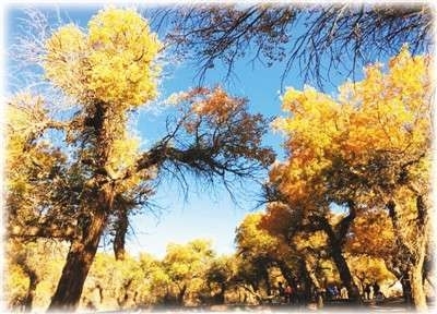 在赶往八道桥的旅游大巴上,一位背着双肩包的矍铄老人站在我的身边,像是早已熟识。望着路边匆匆倒退的美景,他热情地告诉我,他刚从尼泊尔回来,在广州乘飞机到银川,再到这里。在额济纳待两天,就去长白山。这里太美了,尽管已经70多岁,但并不觉得累,他还要去漠河。老人的话音一落,人们纷纷向他投来既羡慕又敬佩的目光。不知是身置美景给老人以精气神,还是老人的勇气和话语给人以力量,感觉我们是乘车在金黄色的画廊中穿行。