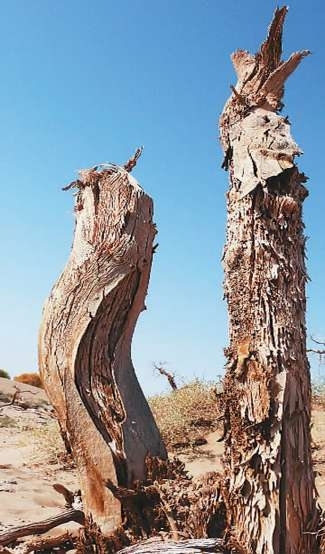 静静地观看这遍地干枯的胡杨,感到这里更像是生命的祭奠场。因为地下水位下降,气候严重干旱,曾经水木茂盛的美丽胡杨变成眼前的怪木丛生。这苍凉悲壮的怪树胡杨是自然给予人类最深刻的警示。