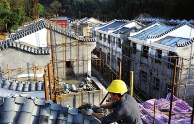 10日,崇阳县铜钟乡大岭村易地扶贫搬迁安置点正在进行立面装饰。