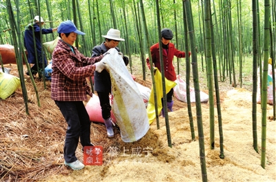 10日,崇阳县桂花泉镇长富雷竹专业合作社的雷竹基地,20多位村民正在为雷竹铺上一层厚厚的稻草和谷壳,以达到保湿增温的成效。