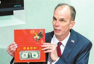 即将发售的鸡年“吉利钱”产品沿用红色封套的设计。封面上印有一只挺立鸣叫的鎏金公鸡,还印有“金鸡纳福”“恭贺新禧”等字样。在内页下方,嵌有一枚未流通的一美元纪念纸币,编号以“8888”开头。据了解,鸡年“吉利钱”产品预计将发售88888套,售价为5.95美元。