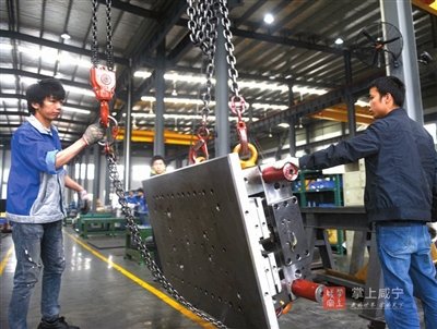 19日,咸宁市洪盛模具科技有限公司工作人员在吊装模具工件准备加工。