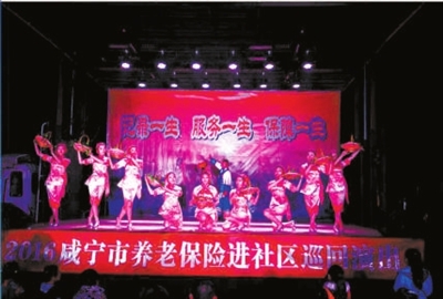 13日晚上,在咸安区工程机械厂,市人社局、市养老保险局联合市歌舞团、七音合唱团,正在开展“送政策宣传进社区”活动。此次演出将先后走进温泉办事处社区、金叶社区、学府社区,极大丰富市民的精神文化生活。 通讯员 黄显春 摄