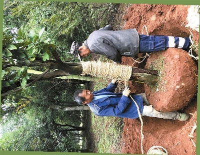在群力村6组的一片林木基地里,两个村民正在帮忙移栽一棵挂果的柚子树。村民告诉记者,很多人慕名来到村里,挑选自己喜爱的园林树木。
