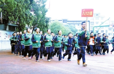 4日,通城寄宿中学学生在跑操。通城县各中小学10年如一日,坚持组织师生每天上午大课间跑操半小时,师生良好习惯和体能素质得到双提升。 通讯员 黎伟 摄