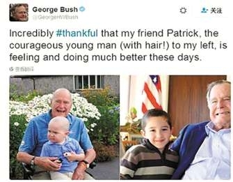 帕特里克被诊断出血癌之后,2013年,老布什同特勤局几名特工一起剃光头表示支持小男孩。