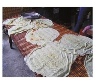 起锅之后,将直径大约50厘米的米饼折叠起来,切成丝儿——这大概是它叫饼折的原因吧。新烫的饼折可以直接食用,但大部分被切成丝儿并晒干。