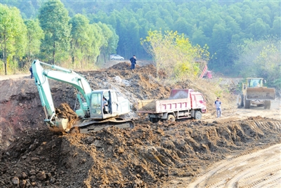 6日,嘉鱼县高铁镇组织施工机械为当地仙人洞林场修建防火通道,挖掘蓄水池。
