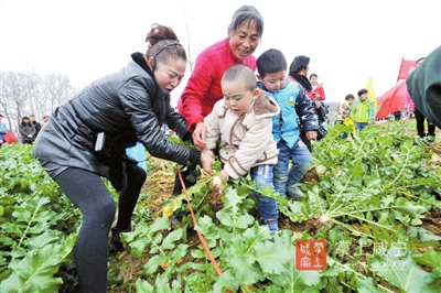 在“拔萝卜,拔萝卜……”的儿歌中,高桥小博士幼儿园亲子拔萝卜赛正式开始。家长领着自己的孩子奋力拔萝卜。一个戴着小熊帽的小朋友弯下腰向后使劲,但力气太小,反而向前栽倒,惹得周围大人哈哈大笑。不一会儿,比赛结束,每个人都至少装满了一袋萝卜。此时,众人期待的萝卜宴开始了。