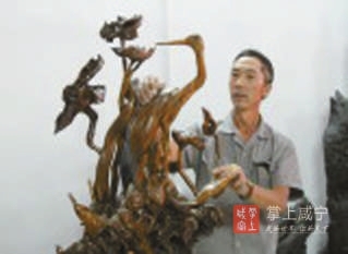 令刘明华困惑的是,创作一件好的根雕作品,首先要有上等的根材,寻找合适的根材是关键。然而找到理想的根材十分艰难,回顾自己的根雕创作之路,他的最大体会就是美的根材存在于大自然之中,必须要到大自然中去寻找、发现。于是,一有时间他就到处搜集各种形态奇特的废根,然后巧用心计,反复推敲琢磨,从而激发创作灵感。