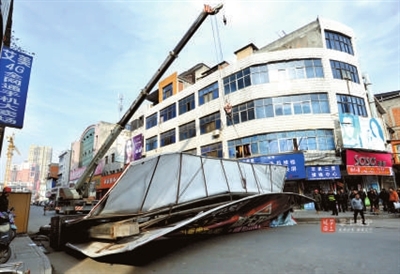 日前,崇阳县民主路,县城管执法局正对过街彩虹桥广告牌进行拆除。为整治城乡环境“脏、乱、差”现象,该县启动环境综合整治百日行动,将开展环境卫生、市容市貌、交通秩序等7个方面的专项整治行动。