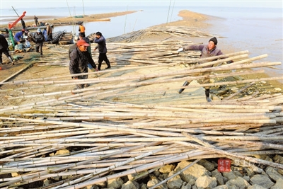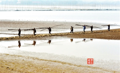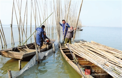 一旁,驾驶着机船的渔民们,或忙着收网,或配合将割下的竹子运回岸边。船只在湖面上留下道道涟漪,滩涂上抗着竹子的渔民蜿蜒成一幅画。