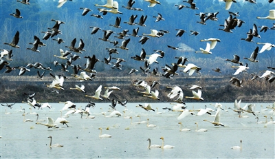东港湖良好的生态吸引着候鸟,每年12月从酷寒的西伯利亚越过高山大河到达这片湖泊湿地,三四月间北返。它们喜欢群栖在沼泽、浅滩,主要以小鱼虾、田螺为食。曾经远离人们视线的候鸟又回到了人们的身边,这要归功于近年来东港湖湿地面积增加,湖面水质生态环境得到了很好的保护。 记者 张大乐 摄