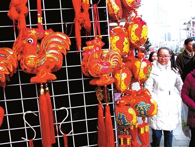 1月15日,游客从上海市城隍庙景区内商家陈列的新春饰品前走过。随着春节脚步的临近,火红的灯笼、喜庆的春联、憨态可掬的鸡饰品纷纷亮相上海街头,节日的喜庆气氛日渐浓郁。据新华社