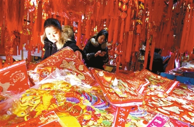 1月23日,市民在位于上海豫园的小商品市场选购新春饰品。